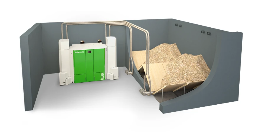 A vacuum suction system transports the pellets carefully to the heating system, whereby the large boiler can be supplied with pellets from either a Flexilo storage tank or a storage room. In a multi-boiler system, the fuel feed is separate for each boiler.