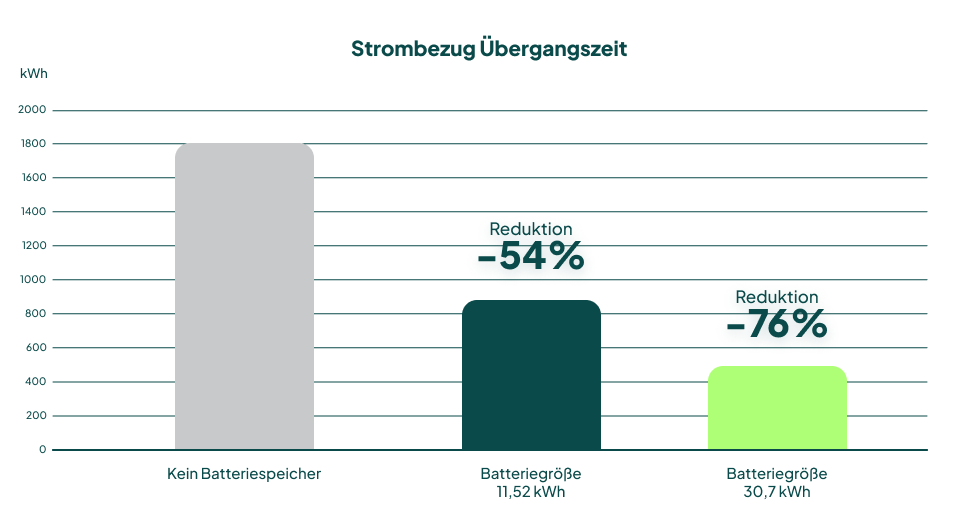 Grundsätzlich ist der PV-Ertrag im Sommer hoch und im Winter niedrig. Betrachtet man den Strombezug in den Monaten, März, April, September und Oktober, ermöglicht ein wärmeintelligenter Batteriespeicher je nach Größe und Auslegung eine Netzbezugsreduktion von bis zu 76 %.