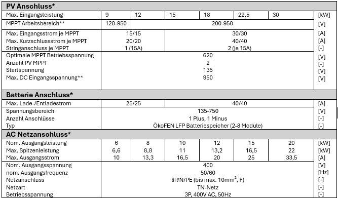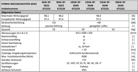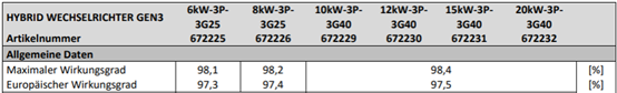Die Wechselrichter 6 kW und 8 kW sind mit 25 A DC begrenzt; die anderen mit 40 A DC.