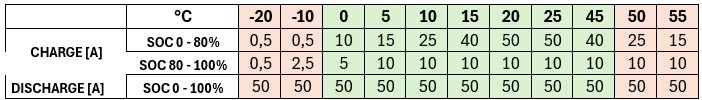 Das BMS begrenzt den Lade-/Entladestrom mit 50 A je nach SOC und Temperatur.