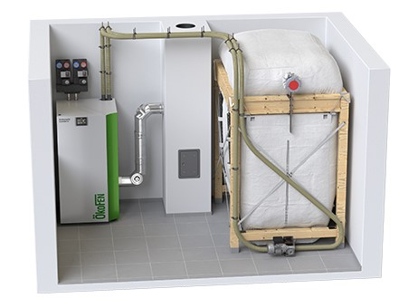 Das Vakuumsaugsystem ermöglicht eine flexible Aufstellung von Kessel und Pelletlager. Die Pellets gelangen zuverlässig vom Pellettank zur Heizanlage. Der Flexilo Gewebetank kann sowohl im Heizraum, als auch in einem anderen Raum in größerem Abstand (max. 20 m) zum Kessel oder außerhalb des Gebäudes liegen.