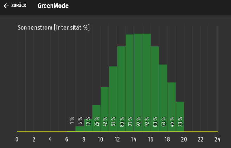 "Die GreenBOX prognostiziert anhand von Wetterdaten und Sonnenstand bereits am Vormittag einen hohen Ertrag an Solarstrom. Daher wird das Laden der Batterie zunächst verzögert und stattdessen der elektrische Heizstab aktiviert. So bleibt die Pelletsheizung ausgeschaltet, und der Batteriespeicher ist bei Sonnenuntergang trotzdem vollständig geladen."