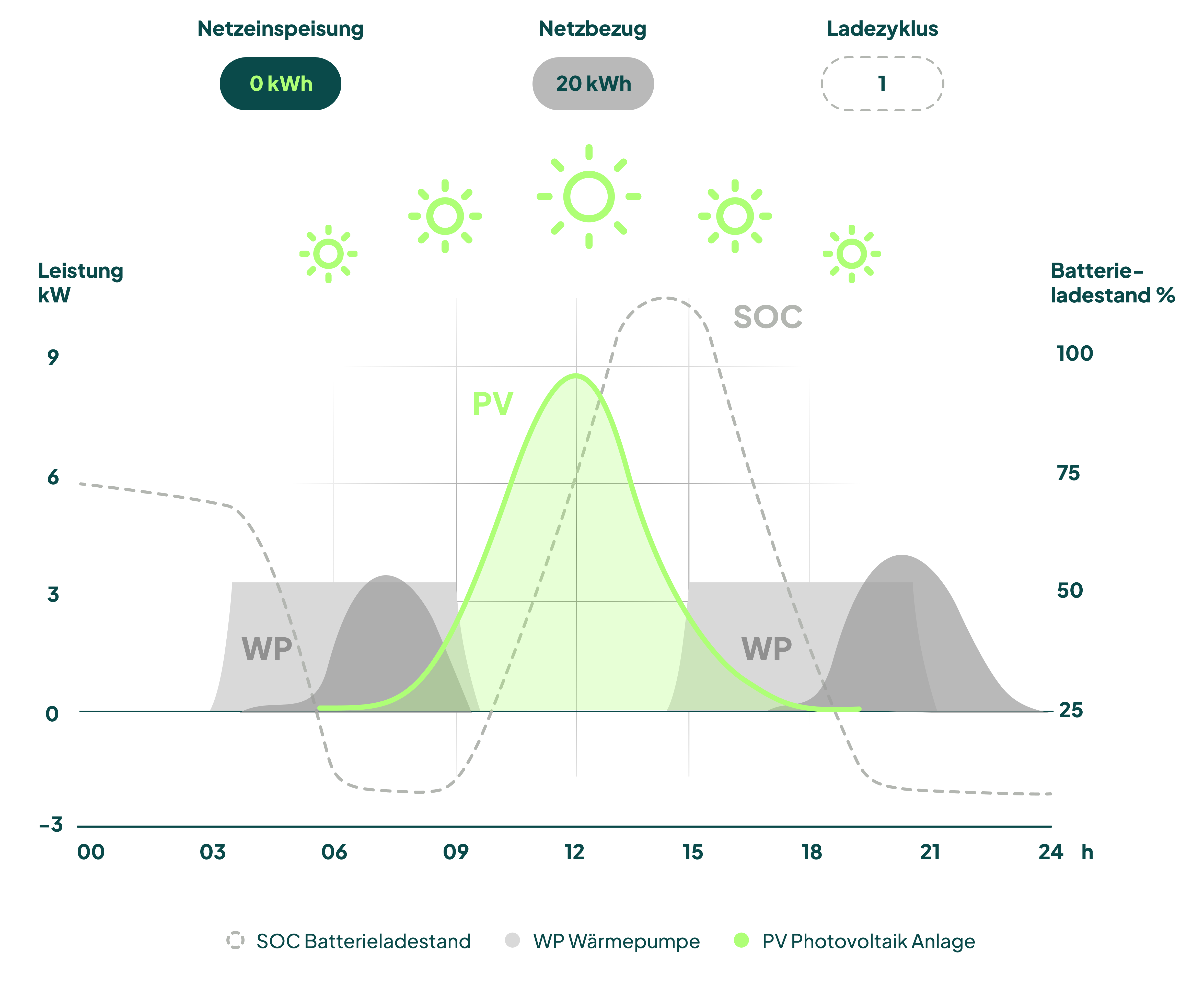 - Aktives Be- und wärmeintelligentes Entladen je nach zu erwartendem PV-Ertrag inkl. intelligenter, höchstmöglicher Einspeisung