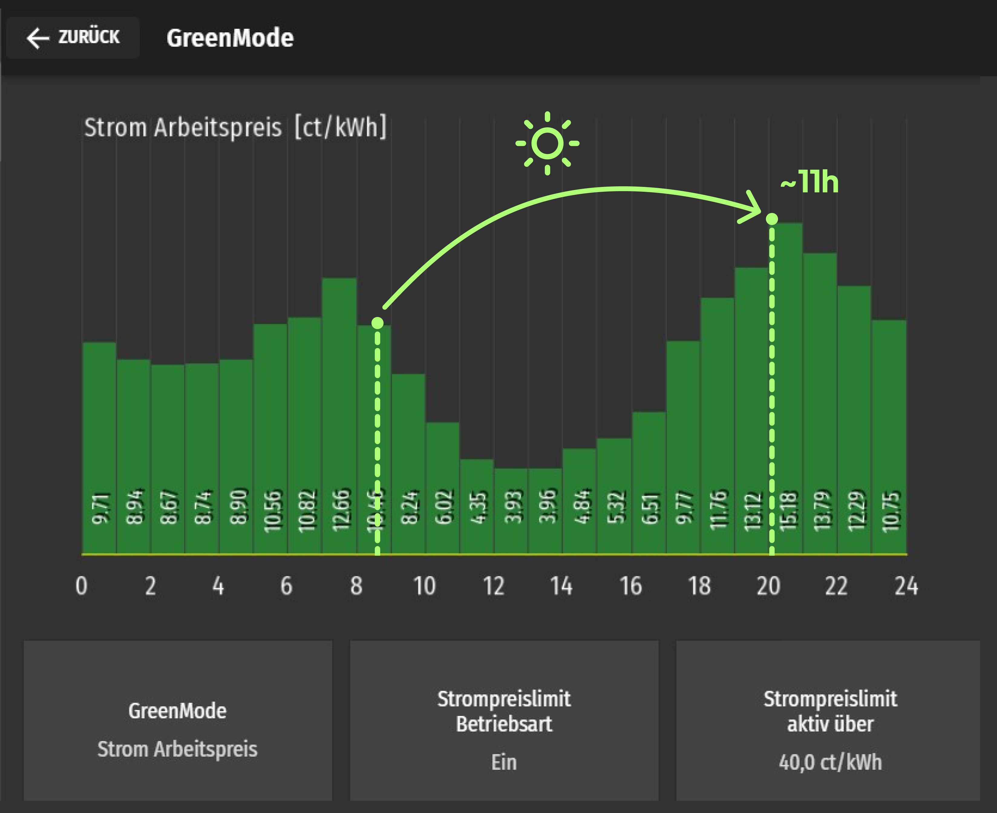 "Die GreenBOX erkennt, wann die Wärmepumpe am Morgen benötigt wird. Schon in der Nacht nutzt sie günstige Strompreisfenster, um die Batterie gezielt aufzuladen. So läuft die Wärmepumpe zu den teuren Morgenstunden mit günstigem, zuvor gespeicherten Strom – effizient und kostenschonend."