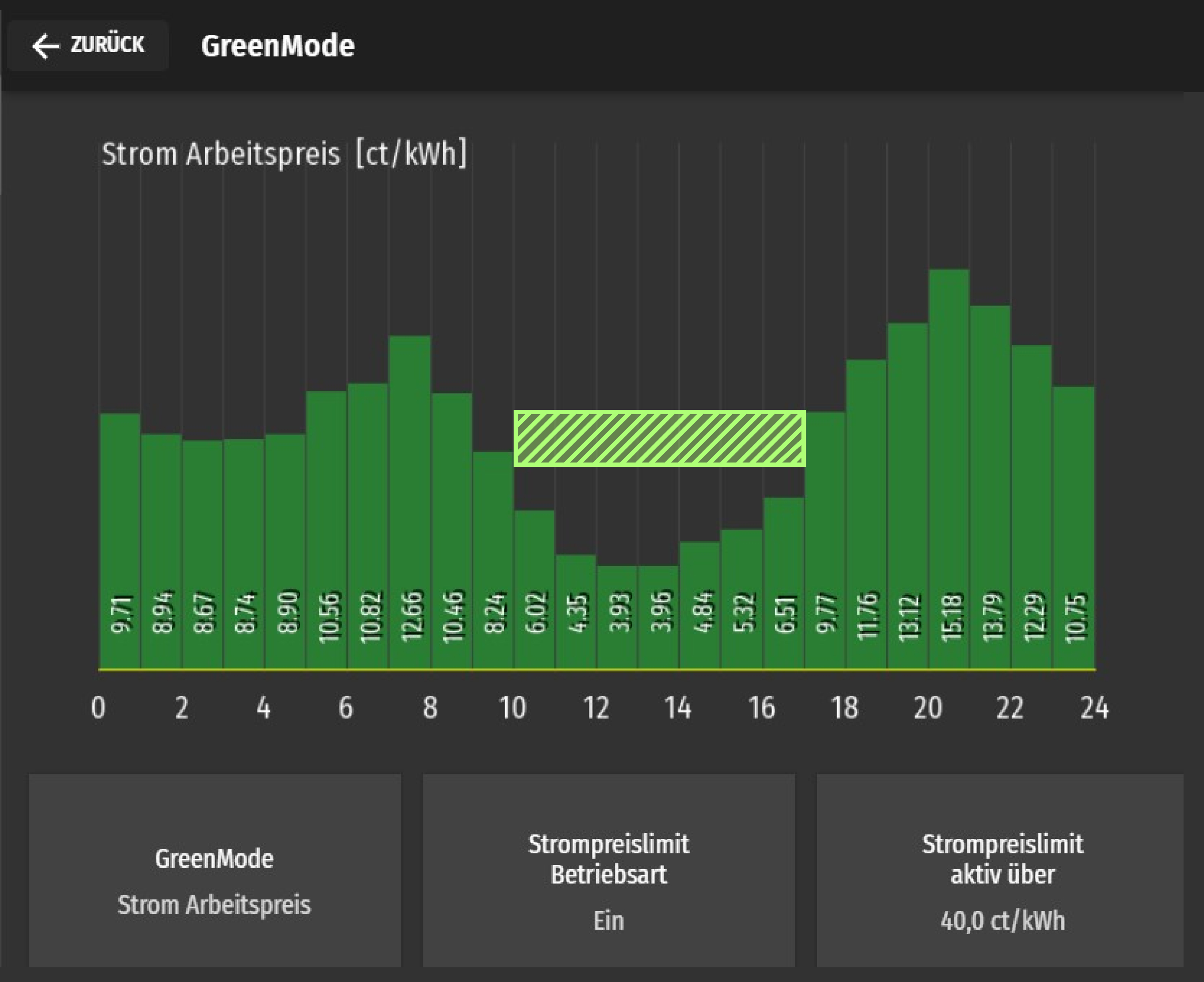 - Aktives Be- und wärmeintelligentes Entladen je nach PV-Ertrag UND automatisierte Beladung auf einen eingestellten Wert je nach aktuellem Stromarbeitspreis