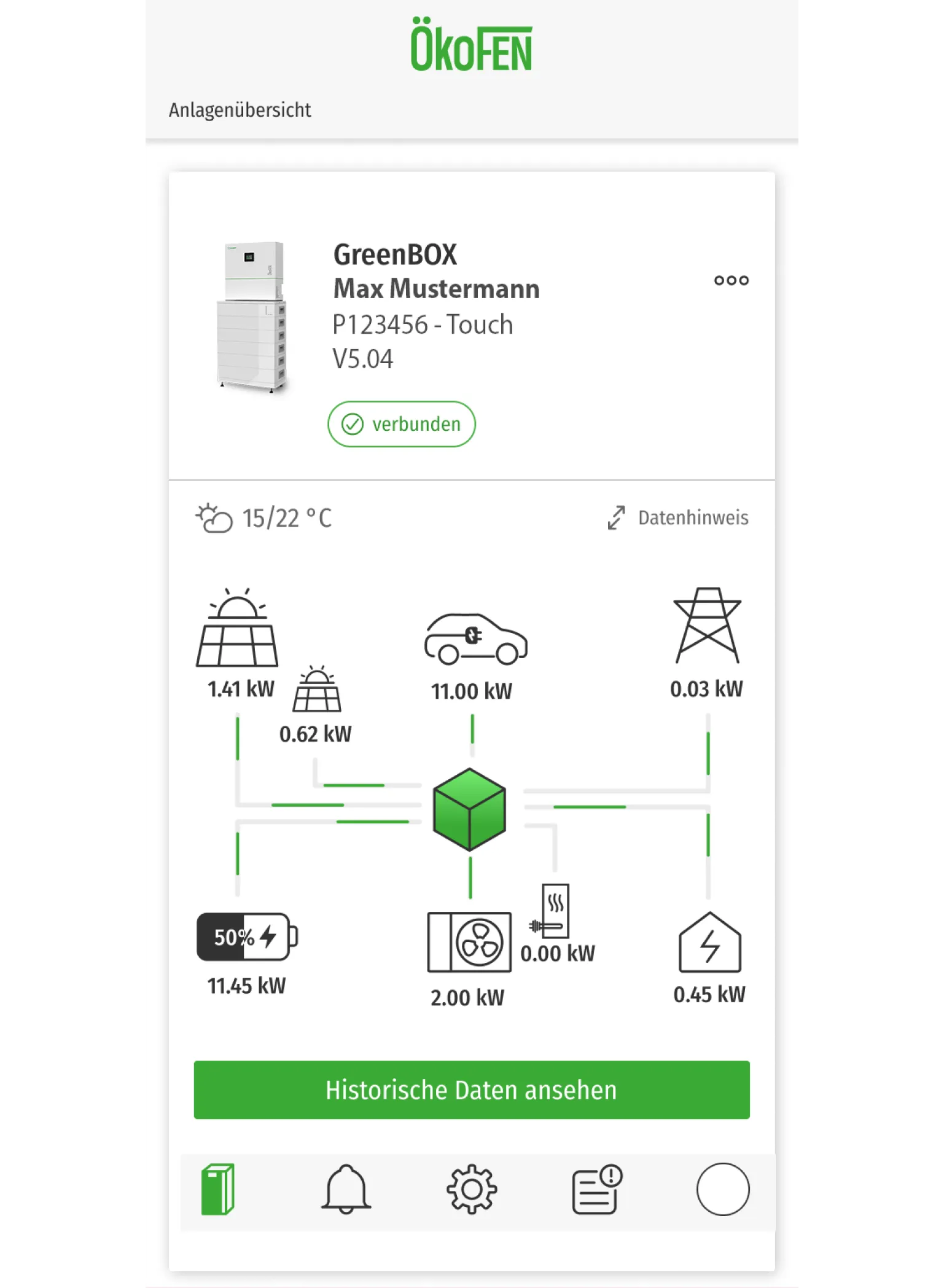 Die ÖkoFEN GreenBOX ist das intelligente Herzstück des Batteriespeichersystems: Ihre smarte Regelung vernetzt sämtliche Hauptverbraucher – von der Heizung über PV-Anlage bis hin zum E-Auto – und sorgt dafür, dass alle Komponenten optimal zusammenspielen. Das Ergebnis: maximale Effizienz im gesamten Haussystem – heute und in Zukunft. Dank der modularen Erweiterbarkeit wächst das System flexibel mit den Anforderungen – sei es durch zusätzliche Verbraucher oder einen Ausbau der PV-Leistung.
