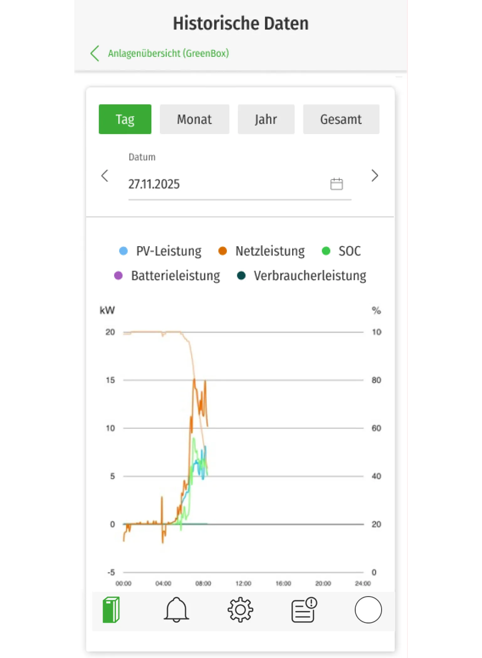- Aktives Be- und wärmeintelligentes Entladen je nach PV-Ertrag und aktuellem Echtzeit-Stromverbrauch.