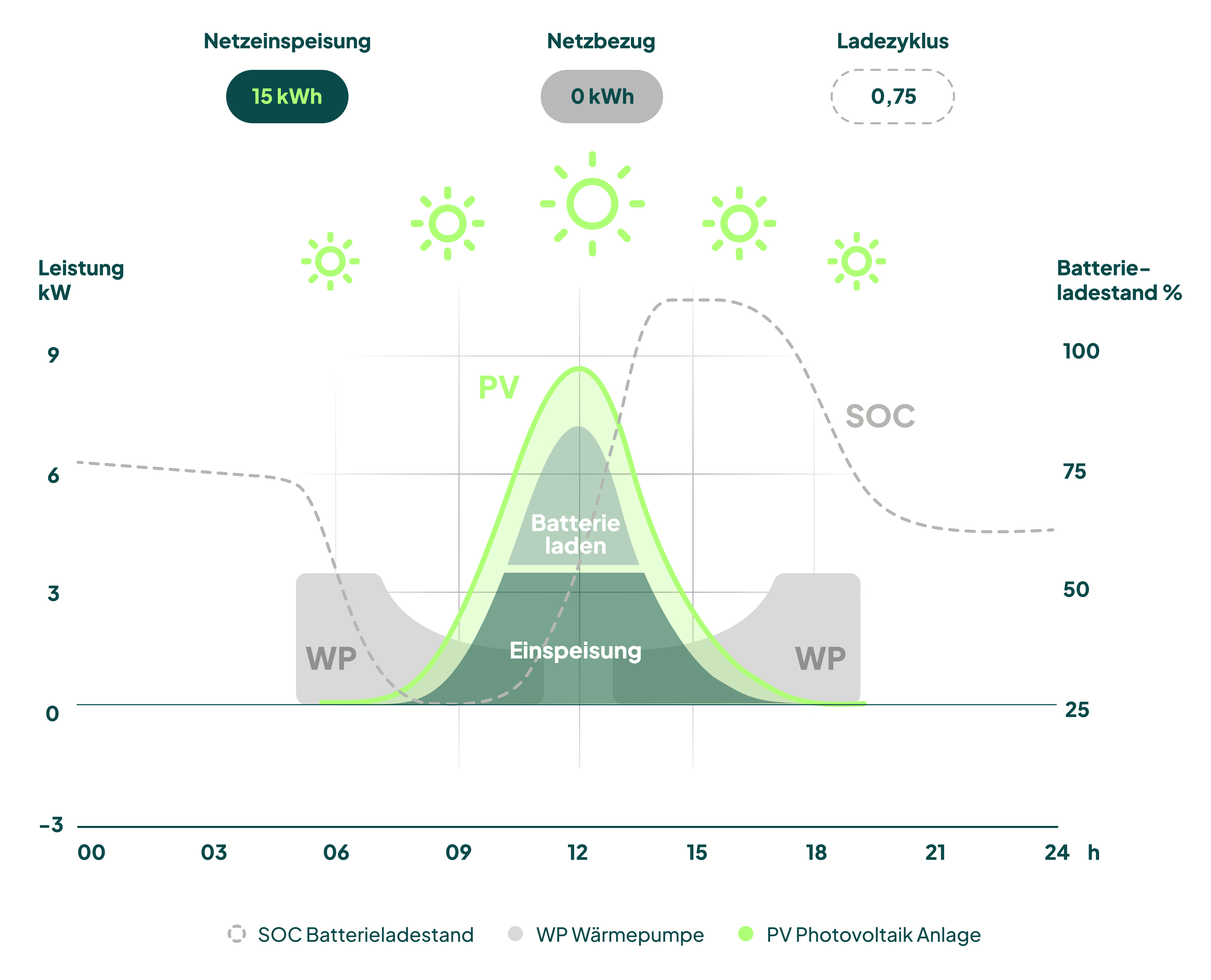 - Aktives Be- und wärmeintelligentes Entladen je nach zu erwartendem PV-Ertrag inkl. intelligenter, höchstmöglicher Einspeisung