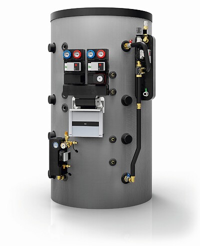 Das neueste Modell ist der Systemspeicher, der als „saubere Heizraumlösung“ bis zu drei Pumpengruppen, Frischwassermodul oder Edelstahlwellrohr und Solarladegruppe kombiniert. Der Heizkreisregler wird auf dem separat bestellbaren Halteblech montiert.