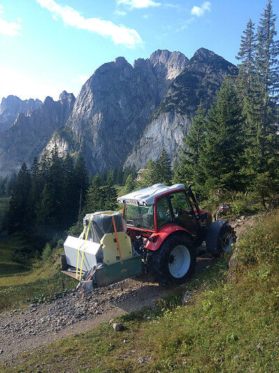 Weniger einfach war die Suche nach der passenden Transportroute. „Insgesamt vier Bauern musste ich kontaktieren, damit wir mit der Heizung über die Wiesen- und Forstwege fahren durften“, erklärt der Hüttenwirt. Im Herbst 2014 war es dann soweit: Die Pellematic wurde nicht wie gewöhnlich mit dem LKW sondern mit dem Traktor zum Einsatzort transportiert. Die Anfahrt der Heizung verlief spektakulär: Hinten auf einer Ladekiste, wurde die Pellematic von der Talstation der Materialseilbahn über die Wiesen-Serpentinen, vorbei an tiefen Felsschluchten hinauf zur Gablonzerhütte auf 1.550 Höhenmetern transportiert.
