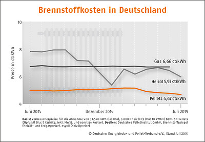 Pelletheizungsbesitzer haben nach wie vor gut lachen, denn auch im Juli ist der Preis für Holzpellets sehr verbraucherfreundlich. Pellets kosten derzeit im Bundesdurchschnitt 233,66 Euro/t, berichtet der Deutsche Energieholz- und Pellet-Verband e.V. (DEPV). Eine Kilowattstunde (kWh) Wärme aus Pellets erhält man demnach für 4,67 Cent. Zu Heizöl beträgt der Preisvorteil 21 Prozent.