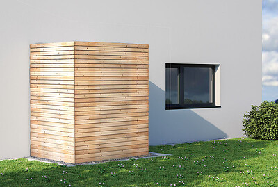 BU: Neben der standardmäßigen wetterfesten Folienverkleidung kann der Flexilo Outdoor Außentank auch mit einer anthrazitfarbenen Trapezblech-Fassade oder beispielsweise mit einer selbst erstellten Holzfassade verkleidet werden.