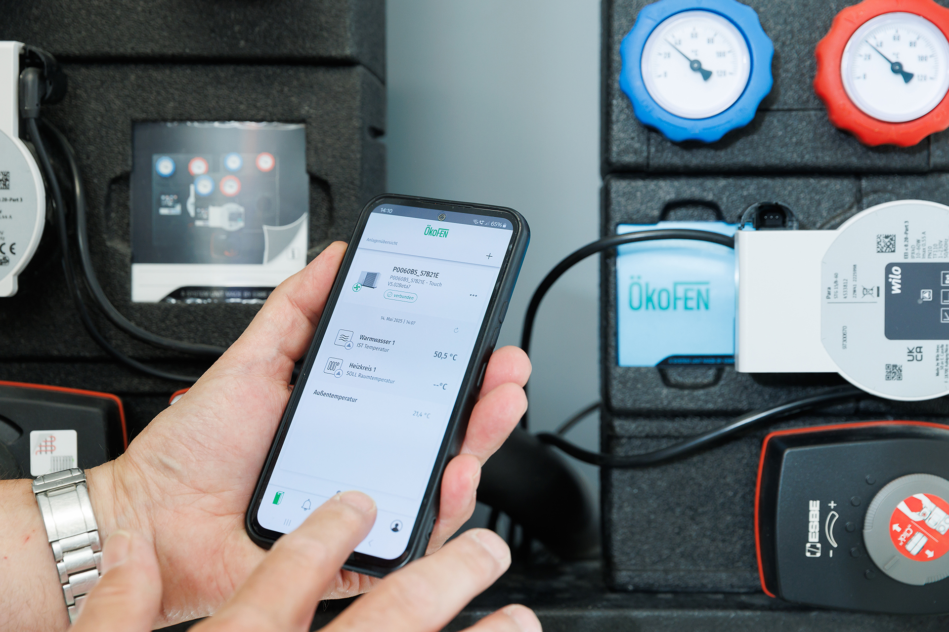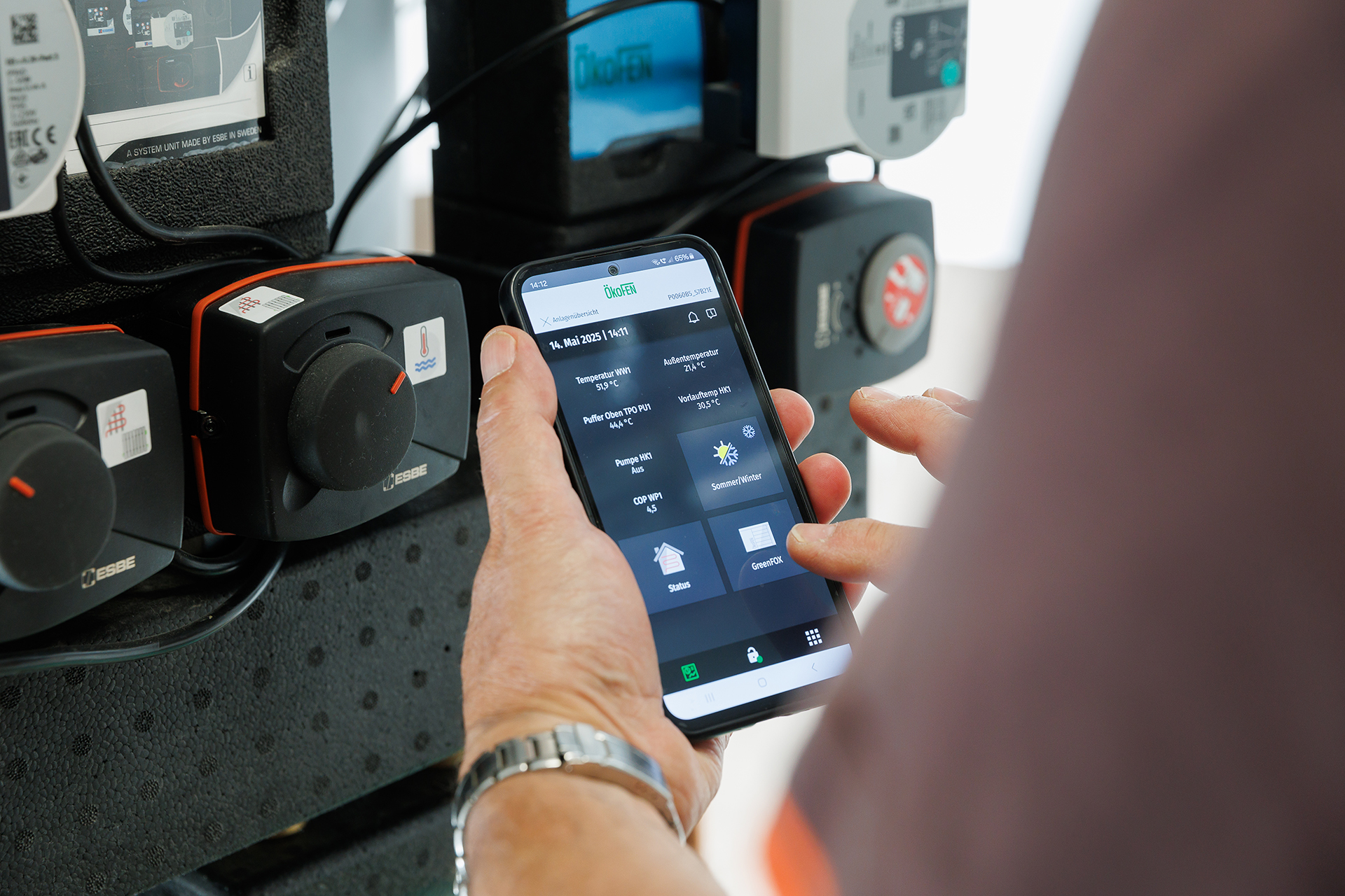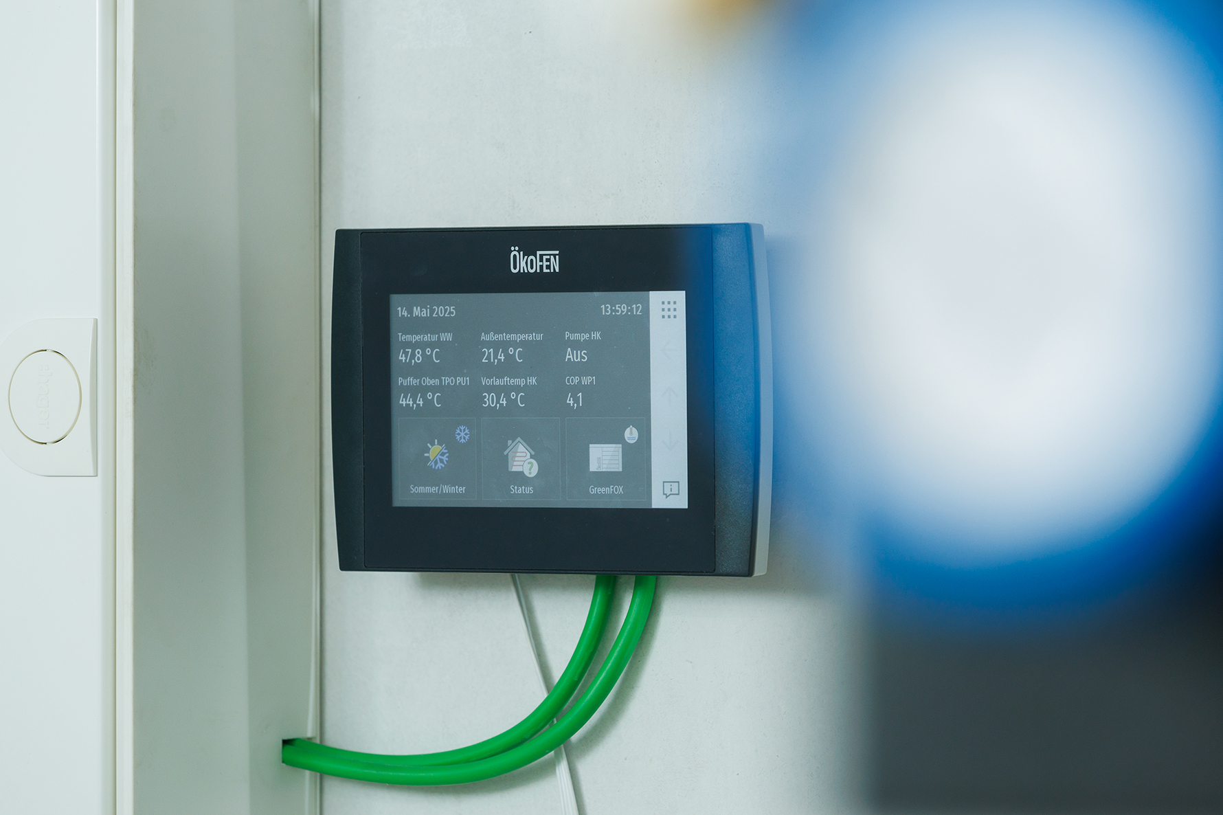 Für das Zweifamilienhaus mit 278 m2 Wohnfläche und einer Heizlast von 19 kW wäre eine Kaskade aus zwei Wärmepumpen GreenFOX® 9/14 notwendig gewesen. Als jedoch die Info kam, dass ÖkoFEN bald eine leistungsstärkere Schwester auf den Markt bringen wird, war klar, dass mit dem Heizungstausch gewartet wird. Und so beheizt nun seit November 2024 als eine der ersten Anlagen in Deutschland die neue GreenFOX® 13/18 das Zuhause von Familie Obenland.