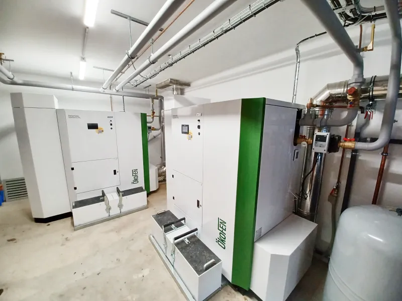 Mise en service en 2025, la chaufferie repose sur une cascade de deux chaudières Pellematic Condens XL de 130 kW chacune, équipées de la technologie ZeroFlame et d’un ballon tampon de 3 000 litres, pour un fonctionnement modulable et performant. L’alimentation se fait depuis une pièce de réserve de 22 tonnes de granulés, avec remplissage par camion souffleur, assurant autonomie et simplicité d’exploitation.
