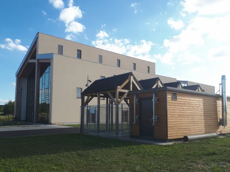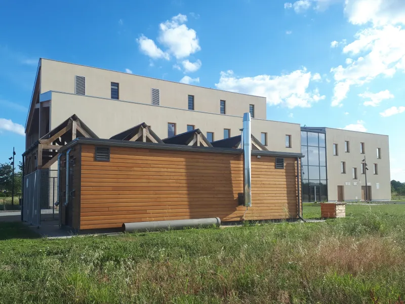 Mise en service en 2023, la chaufferie prend la forme d’une Energy Box préfabriquée, installée en extension du bâtiment. Elle intègre une chaudière à granulés Pellematic Maxi Twin Condens de 128 kW, associant performance, compacité et rendement élevé grâce à la condensation.