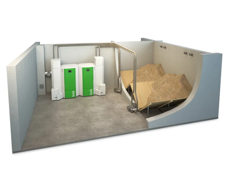 L’alimentation est assurée par une pièce de stockage de 12 tonnes, avec remplissage par camion souffleur, offrant une autonomie confortable et une exploitation simplifiée.